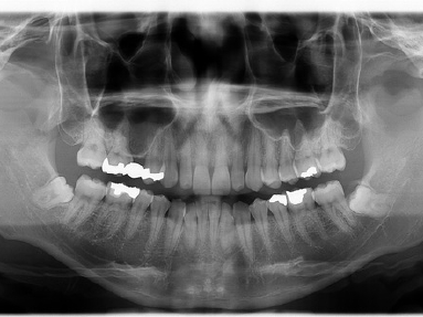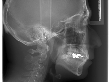 横から撮ったレントゲン写真をセファログラムといいますが、これは主に矯正治療に使用して、顎の発育の成長や骨と皮膚との関係を診査するために撮影しますが、骨が高解像度で表示されるのはもとより、皮膚などの軟組織もはっきりと見ることができます。